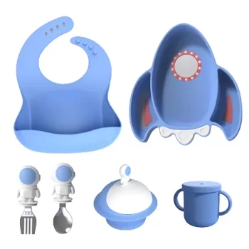 Silicone Baby Feeding Set: Bib, Divided Plate, Bowl, Cup, Spoon & Fork