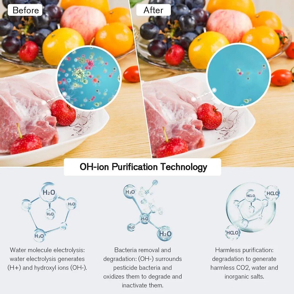 Discover the future of food safety with our Dual-Core OH-Ion Wireless Fruit & Vegetable Pesticide Purifier. Transforming ordinary water into a powerful cleaning agent, this innovative device ensures your food is free from harmful substances, without any chemical additives. It’s not just a cleaning tool; it’s your partner in maintaining a healthy, toxin-free diet.
