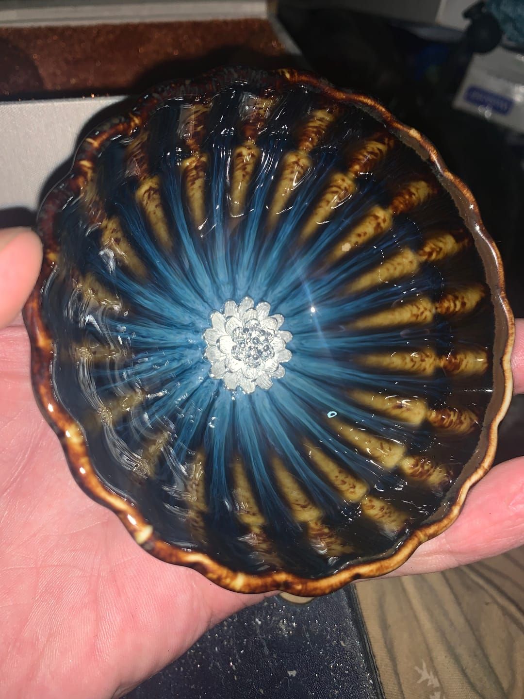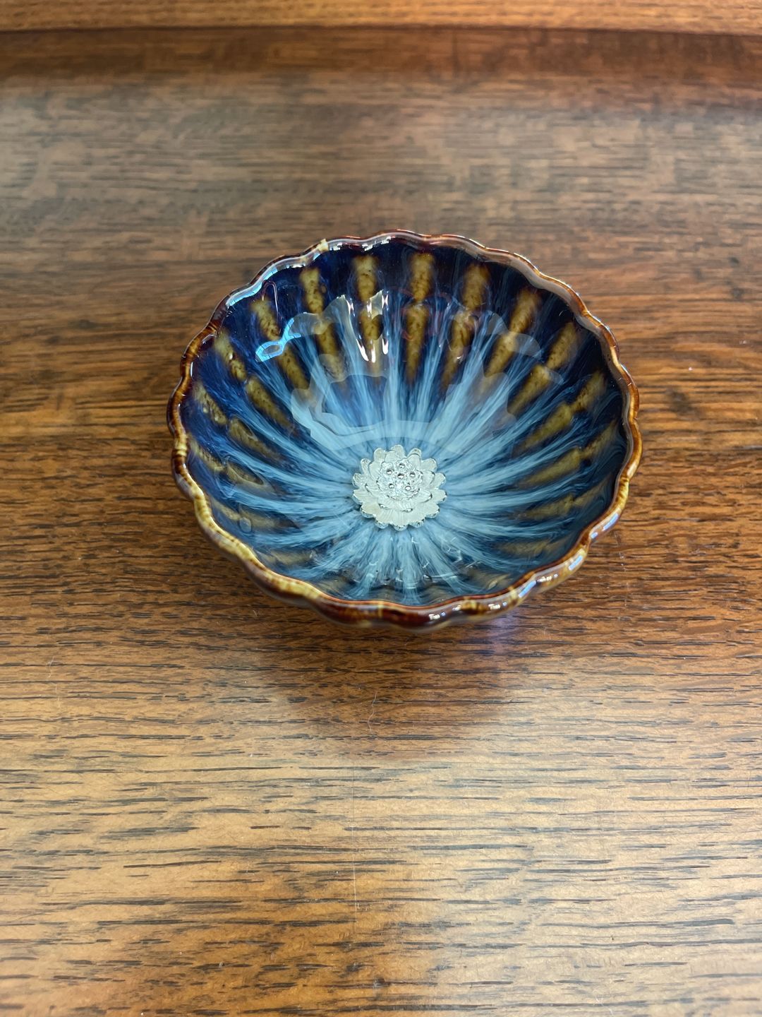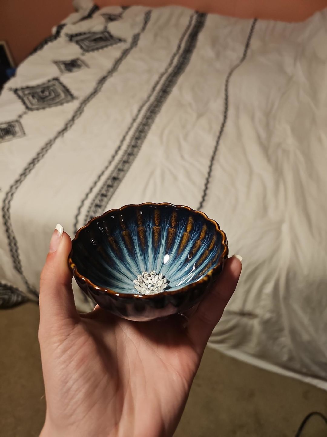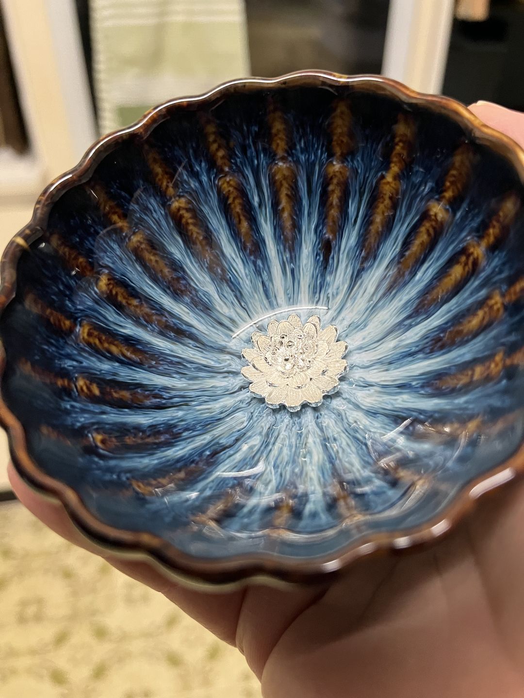 I've been using this cup nearly every day for the past year, and I'm just as enchanted by it now as I was when I first received it. It's incredibly stunning. This cup is fully vitrified and won't impart the same taste-enhancing qualities as unsealed Jianzhan cups, so if you prefer a more neutral taste, this is an excellent choice. The craftsmanship is exceptional - this cup is flawless, as are all the cups I've acquired from Tenmokus so far. It's worth mentioning that tea oils gradually coat the surface of the silver lotus blossom, giving it a beautifully rich golden hue over time. Cleaning this cup has never been an issue - the lotus blossom rarely traps tiny tea particles underneath, and when it does, they are easily rinsed away with cold water