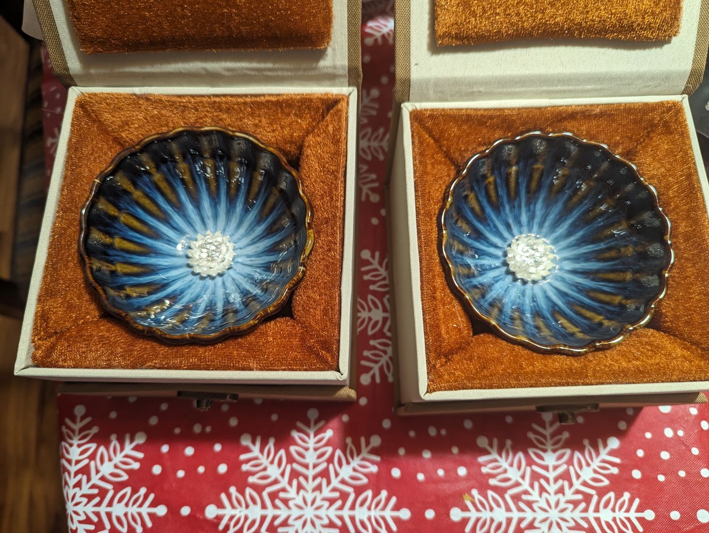I came across these tea cups on Facebook and was immediately intrigued. I had a little internal debate with my bank account – it was undeniably pretty, but did I really need ANOTHER tea cup? However, these cups are unlike my delicate European bone china cups, so I convinced myself that I needed one for my collection. Naturally, I ended up ordering two, and I'm so grateful I did. The Golden Peacock cup is simply exquisite. The scalloped, bowl-shaped cup feels light and elegant, and the silver flower inside adds a delightful touch. The packaging is impressively well-made and protected the cup all the way from Hong Kong to snowy North Dakota without a scratch.
